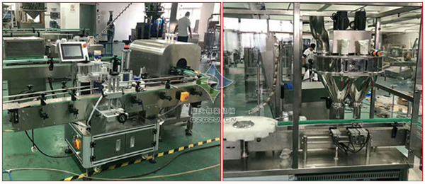 這款多頭瓶裝罐裝粉劑包裝生產線的包裝流程為:理瓶→充填瓶裝,上蓋(包括:瓶子的尺寸與轉盤的尺寸是配套的、重量設定主要靠螺桿旋轉圈數計量)→螺桿上料機送料到螺桿計量機及攪拌→螺桿計量→充填粉劑→旋蓋→轉盤旋轉輸出→工作臺。 粉劑灌裝封口機生產線包裝樣品展示: